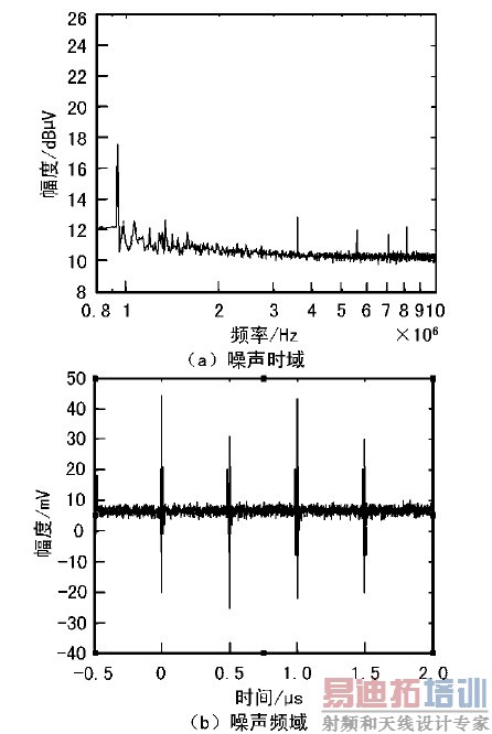 选取一只10nF电容并联在PCB直流供电电源2端。测试结果如图4所示。图4(a)为噪声频域图,频率1MHz的噪声辐度由24dB减少至18dB。图4(b)为噪声时域图,均方根振幅由图2(b)的11.03mV降到滤波后的4.98mV。