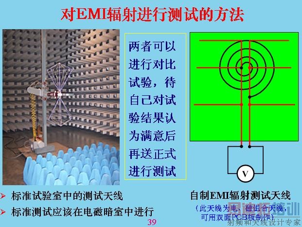 另外对于辐射干扰,我们最注意的就是共模干扰,差模干扰相对来说比共模干扰小很多,我们做过一个试验,在同一个导线里面流过的电容,相差的共模干扰是2500倍。上面就是对辐射进行测试,刚才是共模干扰,其他都是传导测试,其实就是辐射干扰测试,一般就是用天线来测,天线的测试原理就是这样的,量天线和大地之间的电压,这个设备与大地之间有分布电容,前面已经说过了,放这个在上面,与板接地产生分布电容。天线也有分布电容,分布电容不是跟设备大小和距离有关,所以测试的时候都有一个标准,固定设备中间距离有多远,天线面积用多大,还有一套天线,很多天线,不只是一个,计最大的那个,就是测试电压最大的那个,天线对辐射会产生谐振。