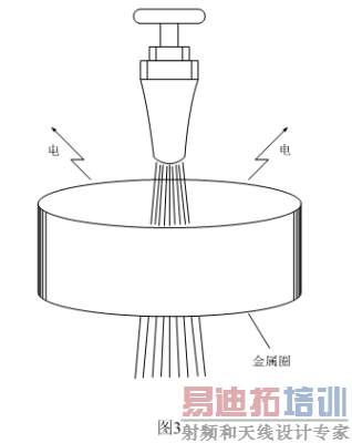 图3是一个让物体产生高压电的原理图,在水龙头的下面安放一个用金属薄片制作的圆圈(用金属罐头盒改制),金属圆圈必须要与周围绝缘,然后让水龙头流出的水正好从金属圆圈的中央穿过,金属圆圈很快就会带电,并且电压非常高,一般可达一万伏以上。用试电笔做试验时,当试电笔离金属圆圈还很远的地方,就可以看到试电笔被点亮,甚至拿一个小荧光灯靠近,也可以看得到荧光灯微亮。这说明电压非常高,但对人体不存在被触电的危险,因为金属圆圈的电容量很小,存储的能量有限。