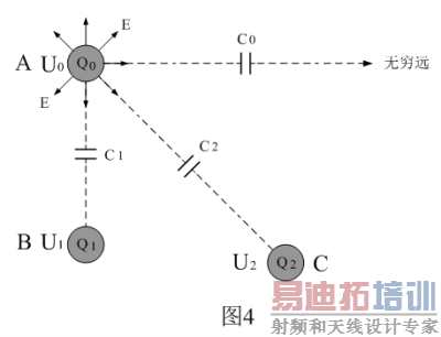 实际上电场干扰,或电场感应,都是通过电容的工作原理进行的,电场对电子设备中其它电路的干扰,不但与电场强度有关,还与被干扰电路参考点的位置有关,以及带电物体的电容量有关。如果要精确计算某带电体对其它物体产生的电感应,就必须熟练地应用(6)式和(7)式来计算各个物体之间的电容。同一个带电体相对不同的其它物体,因为相对位置以及电场强度不同,其电容量也不同。知道了电容容量就可以计算电容的充放电过程,从而可以求出电压、电流、功率等各种参数。