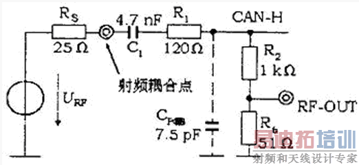 耦合网络组成的要素是R1和C1,R1的选取应使CAN-H到搭铁的耦合阻抗与IEC 61967-4规定的阻抗150×(1±0.2)Ω相匹配,同时C1的选取应使耦合网络的等效阻抗接近于单线CAN网络的典型负载。C1还决定了射频耦合网络在低频范围内的转折频率f: