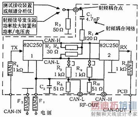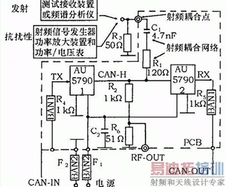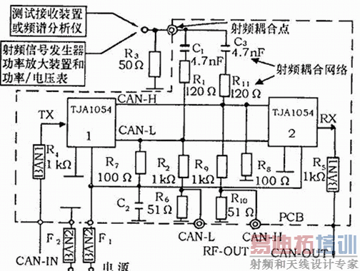 由于被测装置将在汽车上使用,所以测试方法应从现在的汽车EMC测试国际标准ISO 11451、CISPR25、ISO 11452中挑选。这些标准对应不同的测试装置和耦合方法,提供了一系列的测试方法。选择EMC测试方法的依据是在有限设备的支持下,测试中以反复地进行。为此,需要在被测电路和测试仪器之间提供一种已知的、易复现的耦合方式。对于评价收发器类型的集成电路,采用被测装置和测试仪器之间直接耦合的方法即可达到上述要求。国际标准ISO 11452-7提供了直接耦合的测试方法,可用于元件级抗扰性的测试。