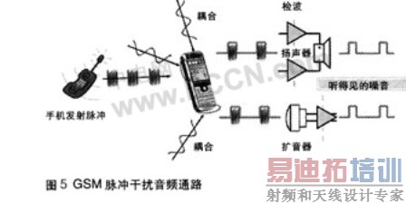 当手机与基站通讯,或两个手机彼此接近时,发射脉冲通过扩音器,扬声器,或头戴式耳机线传人音频通路。见图5。