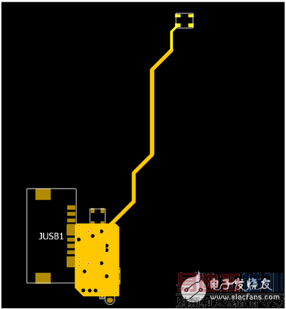 我们选择一条5V的USB的走线,电源由右上角馈入,在左下角经过了4颗电容后到达USB接口。