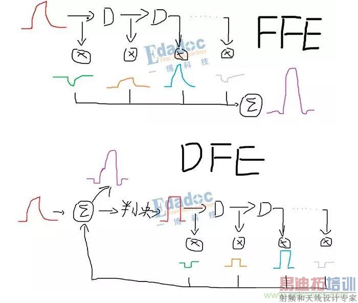 DFE (Decision Feedback Equalizer, 判决反馈均衡器)。这两个就跟FIR比较像。只不过FIR中的乘法器是乘一个脉冲信号,而FFE与DFE中的乘法器,乘以信号本身。看图理解: