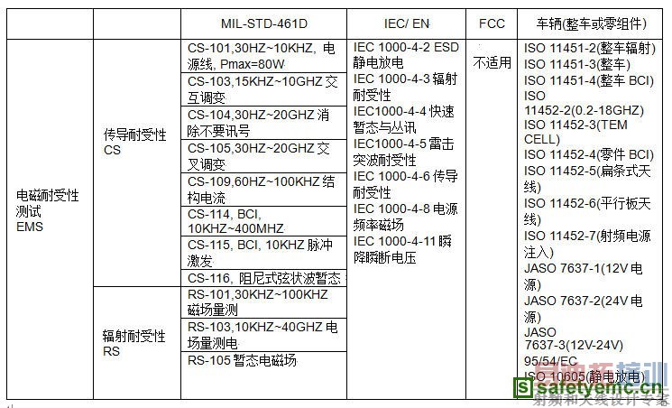 表一 常见美国军用, 欧美商用及车用电磁干扰(EMI)测试项目摘要比较