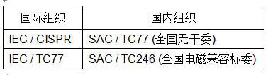 EMC和汽车EMC标准化组织分别见表1和表2。涉及电磁兼容的国际上的标准化组织主要是国际电工委员会(IEC)下属的两个主要组织,国际无线电干扰特别委员会(CISPR)和第77技术委员会(TC77),国内归口组织分别是全国无线电干扰标准化委员会(SAC/TC79)和全国电磁兼容标准化委员会(SAC/TC246)。