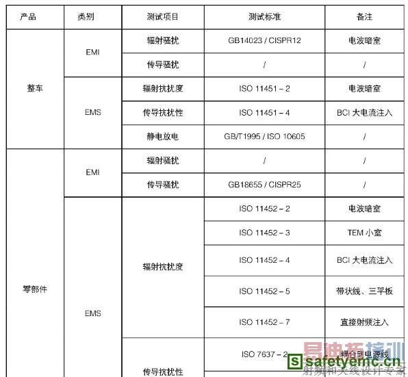 汽车EMC为:整车骚扰;整车的抗扰;电气部件的骚扰;电子部件或电子控制系统的电磁抗扰。所以汽车EMC测试分为EMI测试和EMS测试。EMI测试如辐射发射骚扰、传导耦合/瞬态发射骚扰,EMS测试如射频电磁场辐射抗扰度试验、传导耦合/瞬态抗扰性、静电放电(ESD)、大电流注入(BCI)、横电磁波(TEM)小室、带状线等试验。表6列出了目前国际和国内对整车和零部件的EMI和EMS测试项目及对应标准。