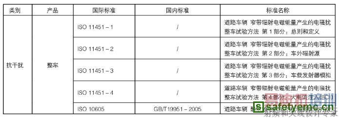 汽车电磁兼容标准是汽车电磁兼容设计、仿真和测试的基础,它就整车和零部件的干扰限值、抗干扰水平、测试方法和测试环境等作了具体规定。表3、表4、表5分别从发射和抗扰度两个方面列出了整车和零部件的国际和国内标准情况。