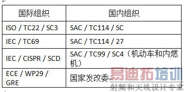 在汽车电磁兼容领域,主要是IEC/CISPR和国际标准化组织(ISO)。CISPR下设的D分会(SCD)是关于车辆和内燃机驱动装置的无线电骚扰分委员会,主要负责制定汽车整车和零部件的无线电骚扰特性标准,国内归口组织是全国无线电干扰标准化委员会D分会全国机动车辆和内燃机标准化分技术委员会(SAC/TC79/SC4)。ISO/TC22主要是制定汽车整车和零部件的电磁抗扰度标准,国内归口组织是全国汽车标准化技术委员会(SAC/TC114)。