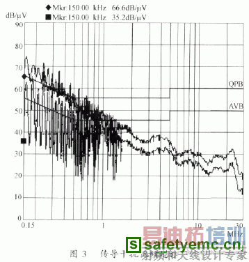 辐射骚扰预测结果在30~50MHz 和100MHz 处超出限值,如图4 所示。
