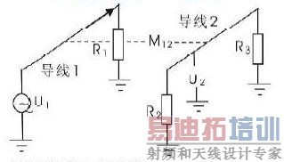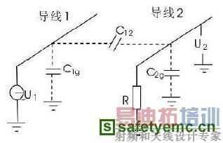 感应干扰分为电感应干扰和磁感应干扰两种,其基本电路图如图2和图3。U1为导线1的电压,I1为导线1上电流,U2为导线2上的干扰电压,C12为两导线间的电容,C1g和C2g为导线1、导线2与地的电容,M12为两回路间互感,R为各电路的电阻。