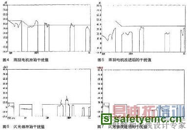 雨刮电机是设备中典型的感性负载干扰源,功率较大,采用零部件测试方式对其测量,先对电机的换向器结构做了调整,并在电机内部对电路做了滤波处理。图4、图5是改进前后的结果,射频段干扰也有明显改进。
