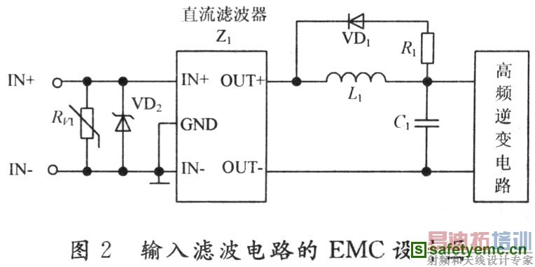 VD2为瞬态电压抑制二极管,Rv1为压敏电阻,它们都具有很强的瞬变浪涌吸收能力,能很好地保护后级元气件或电路免遭浪涌电压的破坏。Z1为直流抗电磁干扰滤波器,必须良好接地,且接地线要短。L1和C1组成低通滤波电路,当L1的电感量较大时,必须增加VD1和R1形成续流回路,以吸收L1断开时释放时的电场能量,否则,L1产生的电压尖峰就会形成EMI。L1的磁芯使用闭合磁芯,可以避免开环磁芯的漏磁场形成EMI。C1采用大容量的电容,可以减少输入线上的纹波电压,减弱在输入导线周围形成的电磁场。