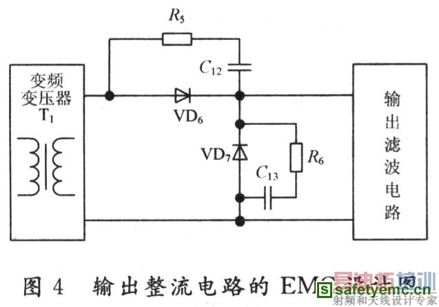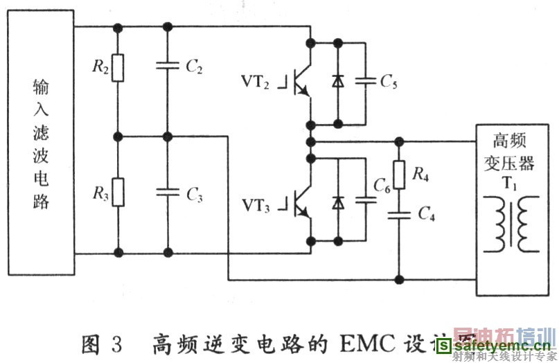 C2,C3,VT2,VT3组成半桥逆变电路,VT2,VT3为IGBT或MOSFET等开关管。R4和C4构成EMI吸收回路,或在VT2,VT3两端并联C5,C6,由于VT2,VT3开通和关断时,开关时间很短以及引线电感、变压器漏感的存在,回路会产生较高的di/dt,du/dt,从而形成EMI。C4,C5,C6采用低感电容,其容量的大小由公式LI2/2=C△U2/2求得C的值(L为回路电感,I为回路电流,△U为过冲电压值)。
