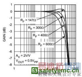 从图2可以看出改变回授电阻时频宽的变化。在最右边RF等于147奥姆处,您可以看到频率反应正好达到最大值。该曲线还具有最大频宽。将电阻降到远低于147奥姆会导致在脉波反应时产生共振电路的振铃,而再低时会发生实际振荡。RF = 300的曲线具有极佳的平坦度和增益,而且还具有可与峰值频率反应相媲美的频宽。因此,我们可以完成很高的稳定性,而未损耗大量的频宽。如果应用只需50或60 MHz的频宽(高于该值就会产生噪声),您可以透过改变回授电阻来调节器件的频率反应。使用这一类频宽有限的快速放大器的主要原因是它能够提供极佳的讯号逼真度。