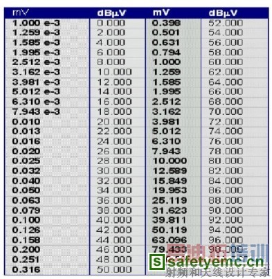 表二是dBμV与mV的快速转换对查表,我们可以利用上述的公式来转换dBμV、mV;或利用表二查得。