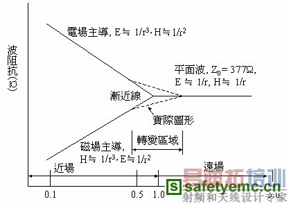 近场(near field)(磁和电的成份)和远场的关系,如附图一所示。所有的波都是磁场和电场成份的组合。这种组合称作「Poynting向量」。实际上,是没有一个单独的电波或磁波存在的。我们之所以能够测量到平面波,是因为对一个小天线而言,在距离来源端数个波长的地方,其波前(wavefront)看起来像平面一样。