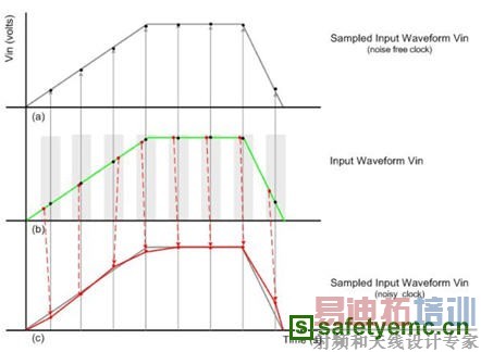 图一中,(b)显示非对称梯形脉波的输入波形(Vin)。如果使用完美的数据转换器与 无噪声频率来量化Vin,则图一(a)显示输入波形的图形。同时,图一(b)中黑色的点代表所需的取样点。图一(a)上半的曲线显示这些点的平移,而这些点形成波形无失真的副本。假设取样频率有噪声(抖动)成分,图一(b)中阴影区表示取样频率边缘可能发生的时间范围。红色的点代表偏离的取样位置,这些点落在可能的频率边缘的范围内,但并不在阴影区的的中央。图 1(c)显示偏离的取样位置,而记录在Y-轴上的各个数值为(偏离的)取样点Vin 的振幅。由于数据撷取系统不知道任何对于频率噪声或任何补偿方式,在 X-轴上各个相对应的数值为在正确时间上的「完美的」 取样点。