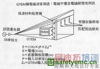 横电磁波(Transverse Electro Magnetic,TEM)室是利用传输线原理,由同轴线演变而来,一种内部能传输均匀横电磁波之长方形测试室。它是电子电机设备电场辐射耐受性试验之理想装置,除了可进行射频连续波耐受性,脉冲波耐受性试验外,还可用于测试电子电机设备所产生之辐射干扰,及作为对各种近场测试探夹(如电流注入感应器、电压感应器、场强感应器等)进行校正用之标准场源装置。图为横电磁波室之示意图,如图所示,横电磁波室由矩形外导体和平板中心接地导电板所构成,两端通过四面尖锥过渡区与精密50咫冷型同轴连接器连接,接地导电板用绝缘支架固定,将横电磁波室分成两部分。待测件之供电系统通过电源滤波器进入,长方形横电磁波室之优点是腔体内之场强比较均匀,而正方形横电磁波室之优点是在相同可用空间条件下,工作频率范围较宽,所需用料省,体积较小。与平行板线相类似,待测件在横电磁波室占有之空间一般不超过接地导电板到底板间距的三分之一和前后壁板间距的三分之一,横电磁波室之工作频率与终端负载之匹配情况有关,上限频率依赖于接地导电板到上下底板间距之尺寸,而且与接地导电板到底板间距d成反比,距离越大,上限工作频率越低。为了使横电磁波室之工作频率提高到1GHz范围,于是GTEM(Gigahertz TEM)横电磁波室因应而生,它之外型是斜面角锥状,详加说明如图,待测件放置方式与TEM横电磁波室类似,如图所示,有各种不同之终端负载,因为工作频率与终端负载之匹配情况有关,目前欧美EMC商规已经广泛应用GTEM横电磁波室来执行辐射发射与辐射耐受性测试。