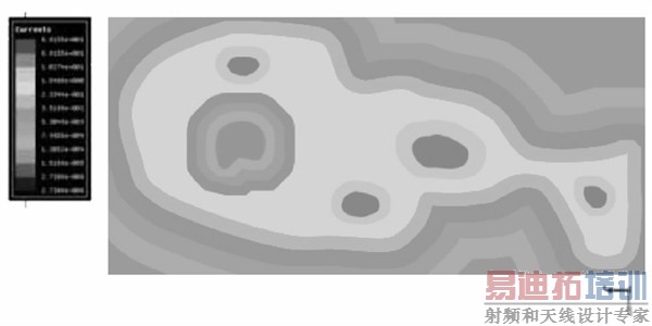 通过在Ansoft Designer中过对以上10个频点的扫描,即可得到了PCB的电流图和近场分布图,这里以50 Hz点为例,分析得到的电流图,E、H近场分布图进行分析,如图3、4、5可见,电路中出现4块场强较强的区域,分布在2个晶振及射频发射电路区域,其中晶振区域存在着敏感元件,而这部分正好辐射强度较大,这对于PCB的电磁兼容来说是不合适的。