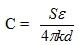 上式中,电容C的单位为法拉,ε为介电常数(在真空中为1),S为带电物体与参照物体之间电力线互相照射的面积(与电场垂直,单位米2),在国际单位制中k = 9×109牛顿•米2/库仑2,d为带电物体到参照物的有效距离(单位米)。