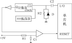 图中将555接成一个多谐振荡器,计数为16进制,当数到第8个脉冲时,Q端输高电平。利用单片机的一个I/O口控制计数器清零端,只要每次清零的脉冲时间小于8个脉冲周期,Q端就保持低电平,当单片机异常时,计数器不能在8个脉冲内清零,则Q端输出高电平,使单片机系统复位。