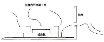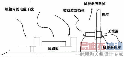 .其次,机箱内线路板、电缆等产生的辐射会直接感应到滤波电路上的各个部位,导致滤波电路失效,如图2所示,这个问题在高频时尤其突出。