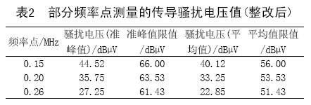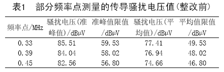 值(QP)和平均值(AV)限值,黑色曲线反映了被试产品在测试频率范围内的传导骚扰峰值电压。虽然电压峰值曲线大大超出了限值,但还不能判定其不合格。因为标准以骚扰电压的准峰值、平均值作为判定被试产品合格与否的依据。表1为在三个频率点读取骚扰电压的准峰值与平均值。