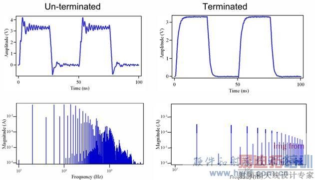 而做完终端匹配后,在时域上,其信号Undershoot与Overshoot的现象大为改善,