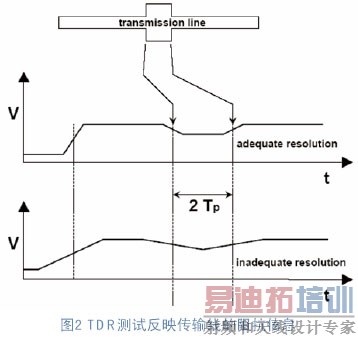 当传输线上出现阻抗不连续的现象时,在阻抗变化的地方阶跃信号就会产生反射的现象,如果将反射信号进行取样并显示在示波器的屏幕上,就会得出如图2所示的波形,从波形中我们可以看出一条被测试的传输线在不同位置上的阻抗变化。同时我们可以比较图2中的两个波形。这是使用两台分辨率不同的TDR设备在测试同一条传输线时获得的测试结果。对于传输线阻抗变化的反映一个明显而另一个不明显。TDR设备感知传输线阻抗不连续的分辨率取决于TDR设备所发出的阶跃信号上升时间的快慢,上升时间快所获得的分辨率就高。而TDR设备的上升时间往往和测试系统的带宽紧密相关,带宽高的测试系统有更快的上升时间。