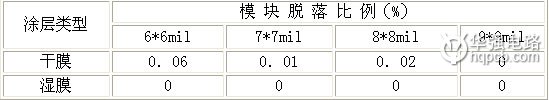 表中的数据表明了湿膜的附着力比干膜好得多,相对于精细线条的制作湿膜要好得多。