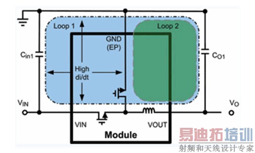 环路2是在内部高端MOSFET的关断时间以及低端MOSFET的导通时间内形成的。内部电感器中存储的能量流经输出旁路电容器和低端MOSFET,最后返回GND(如图1所示)。两个环路互不重叠的区域(包括环路间的边界),即为高di/dt电流区域。在向转换器提供高频电流以及使高频电流返回其源路径的过程中,输入旁路电容器(Cin1)起着关键作用。