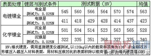 使用显微维氏硬度计测试两种处理方式的金镀层与镍镀层的硬度(见表4)。无论金层或镍层,电镍金都比沉镍金的高,金镀层要高出约7%,镍镀层则要高出24%左右。