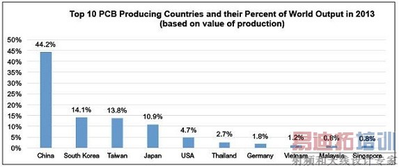 2013年十强PCB生产国及其在线路板厂产值中的份额