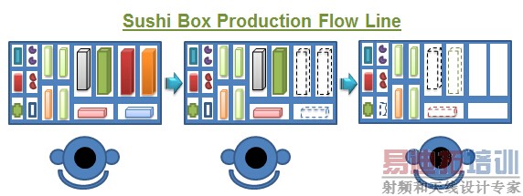 减少产在线物料堆积脏乱的问题。这个方法物料员的责任非常重,其必须先在物料区把所有的物料备齐并装入寿司盒中,所以组装线看起来非常的洁净,没有多余的物料堆积问题。