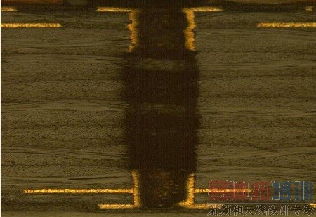 图电镀锡不良导致的孔无铜,切片特征:断铜较对称或板电与图电层断口较整齐,图电层未将板电层包住,即板电层比图电层长。