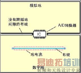 如果系统仅有一个A/D转换器,上面的问题就很容易解决。如图3中所示,将地分割开,在A/D转换器下面把模拟地和数字地部分连接在一起。采取该方法时,必须保证两个地之间的连接桥宽度与IC等宽,并且任何信号线都不能跨越分割间隙。