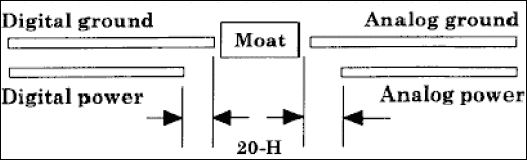 如果在PCB上存在分区,也要在高频带宽区(CPU、以太网、SCSI等)实行20H规则,当数字和模拟区之间提供隔离或滤波时,在分界线上也要实行20H规则。