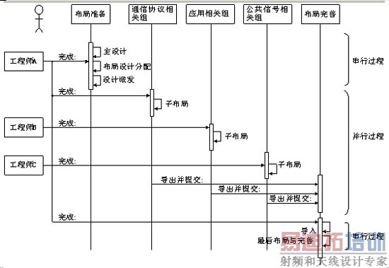 图2为并行设计顺序图。其中:工程师A将主设计(指导入了网表、进行结构约束设计、安装孔已定位的阶段性设计文档)作好,按前述分解方法规划子布局物料标号,并由设计要求进行布局区间分配,制作任务分配说明文档;工程师A分发电原理设计图、物料清单、任务分配说明文档、PCB主设计文件等给其他的2位工程师。
