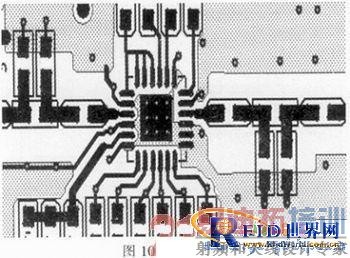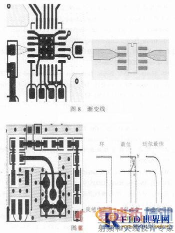 在射频线宽比IC器件管脚的宽度大比较多的情况下,接触芯片的线宽采用渐变方式,如图8所示。