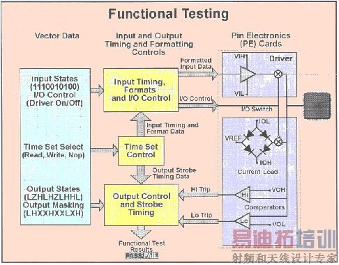 当功能测试执行的时候,测试系统把输入波形施加给待测器件,并一个周期一个周期,一个管脚一个管脚地监控输出数据。如果有任何的输出数据不符合预期的逻辑状态,电压或者时序,该测试结果被记录为错误。
