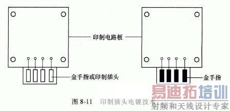 金手指或板边突出部分采用手工或自动电镀技术,如图8-11 所示,目前接触插头或金手指上的镀金已被镀姥、镀铅、镀钮所代替。