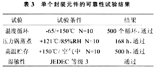 评定了该封装,并对装配可靠性进行了试验,采用球栅阵列封装(45个焊球,间距为0.75mm)履行该封装评定。设计两种焊盘栅阵列封装的试验。表2示出了用于评定封装的技术参数,封装体尺寸为4.5mm×9.00mm,单个封装元件通过温度循环、压力锅蒸煮试验、高温暴光试验和表3所示的湿敏性试验,再者,有关板级可靠性试验,安装在板上的封装通过温度循环试验、压力锅蒸煮试验,弯曲试验和自由落体试验,提供的可靠性如表4所示,尽管凸点支座的典型数值极低,还是不得不注意到没有失效现象发生。