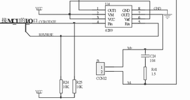 机械驱动部分用小型的直流电动机来进行驱动。由于单片机的驱动能力极其有限,所以需要对单片机的输出进行驱动放大。这里采用BA6289逻辑控制芯片。它可以接收TTL 逻辑电平,用于驱动感性负载。它根据对门锁的不同操作进行逻辑控制,驱动电机的正反转,推动门锁上的锁舌进出。电机正转,锁舌退,实现开门动作;电机反转,锁舌进,实现关门动作。电机正反转控制电路的原理图如图3所示。