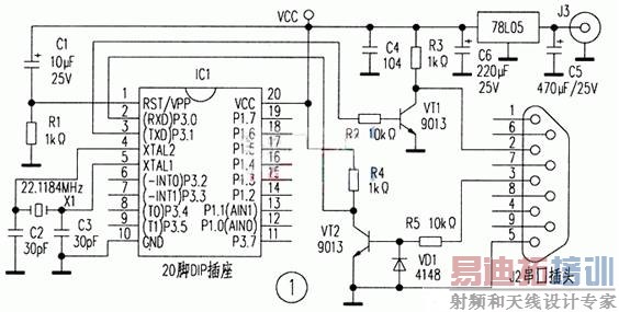 图1是STC12系列单片机简易编程器的电路。IC1是编程时插芯片的20脚DIP插座。R1、C1为被编程芯片提供复位信号,X1、C2、C3为被编程芯片提供时钟信号,VT1、VT2构成简易的RS-232到TTL的电平转换,省掉了MAX232。