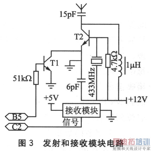 采用433 MHz高频发射和接收模块。433 MHz的高频发射电路在控制脚为高电平时起振并发射等幅高频信号,当控制脚为低电平时停止振荡。因此,可以用控制脚对高频电路完成幅度键控(ASK调制),相当于调制度为100%的调幅。当接收模块接收到433 MHz的等幅高频信号时,信号脚就输出高电平,否则输出低电平。所以接收信号脚的高低电平变化会与发射控制脚的高低电平变化相对应。多个接收模块可以同时接收到同一个发射模块发射的信号,可以实现一机发送,多机同时接收。图3所示电路是高频433 MHz载波的发射和接收模块。433 MHz的高频发射电路在控制脚B5为高平时,三级管T1导通,T2射级接地起振并发射等幅高频433 MHz的信号;当控制脚B5为低电平时,就停止振荡。因此,可以用控制脚B5对高频电路完成幅度键控(ASK调制),相当于调制度为100%的调幅。当接收模块接收到433 MHz的等幅高频信号时,信号脚就输出高电平到C2口,若未收到433 MHz的等幅高频信号则输出低电平。所以接收信号脚的高低电平变化会与发射控制脚的高低电平变化相对应。例如给B5引脚输入图4所示的波形,那么在接收模块的C2引脚上也将出现同样的波形。注意,B5和C2的控制信号分别由主控芯片PICl6F877A的RB5和RC2发出。