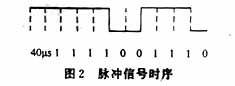 激光调制一般是调制激光的频率或振幅,本方法所采用的技术是将编码技术与激光调制技术结合起来进行综合编译。此处选取AT89C51作为控制模块,他使用广泛,具有稳定性好、性价比高等一些突出的优点,因而,他成为此系统的首选型号的单片机。其具体的编码及调制过程如下:首先在单片机内设定,当检测到一组二进制码时,若是“1”,便通电40μs,若是“0”时,便断电40μs,然后规定当检测完此组二进制数码时,进行循环执行。这样,这一电脉冲便形成一周期脉冲。当用户键入的数字为1998时,那么其二进制编码便是11111001110。那么单片机便控制发出如图2所示的脉冲信号时序控制信号。考虑到接收端也是用单片机,因此还有一个通信协议。这里采用这种方法,一般情况都是低电平,当要发射时先发射4组10μs的信号。此信号发射完才开始发射控制信号。