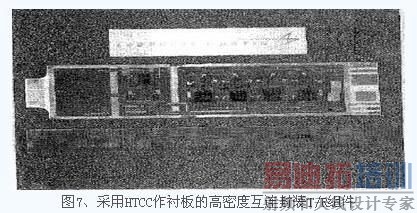 GE 和 Lockheed Martin 等公司合作开发的基于HTCC基板的薄膜多层电路的T/R组件(7),如图7所示。预先将HTCC基板开槽并金属化,将功率芯片贴装预槽内,使之与基板表面持平,然后在其上实施HDI工艺。