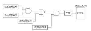 TMS320LF2407提供了PDPINTA输入信号,可保证系统中功率转换电路及逆变电路的安全可靠工作。保护电路结构框图如图6所示。过压/欠压检测信号、过流检测信号、过热检测信号经或门综合后,经过反相输入到PDPINTA引脚。若有故障时,或门输出为高电平,该引脚相应为低电平, DSP的PWM输出管脚全部成高阻状态,PWM输出被封锁。整个过程可由硬件实现。